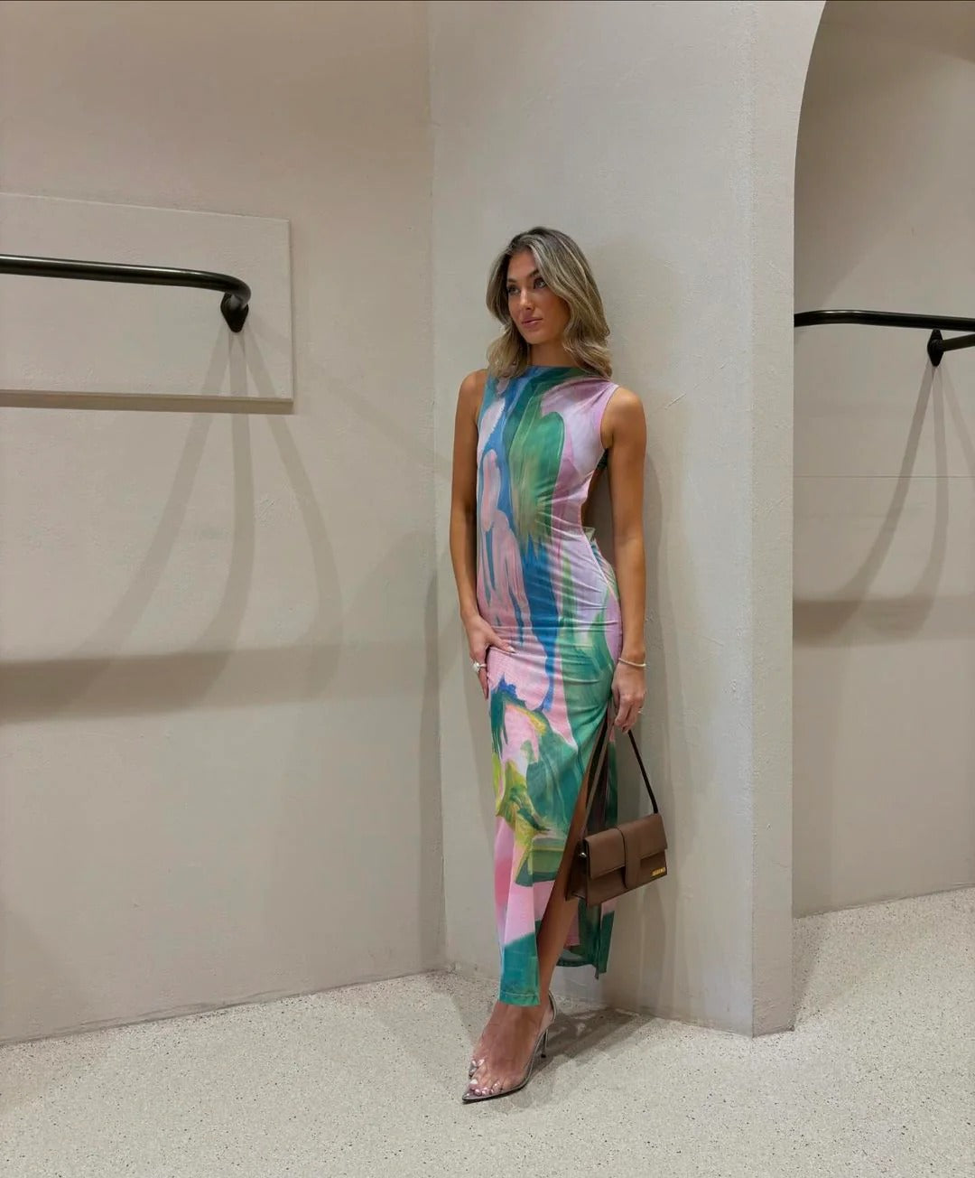 This bold maxi dress is a contemporary statement piece, made from a sheer mesh fabrication with an eye-catching abstract print. The bodycon fit hugs the figure, while the high slit in the skirt adds movement and an alluring touch. This dress is a modern and unique choice for evening parties or upscale social gatherings.
