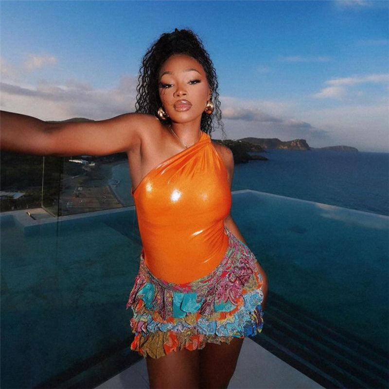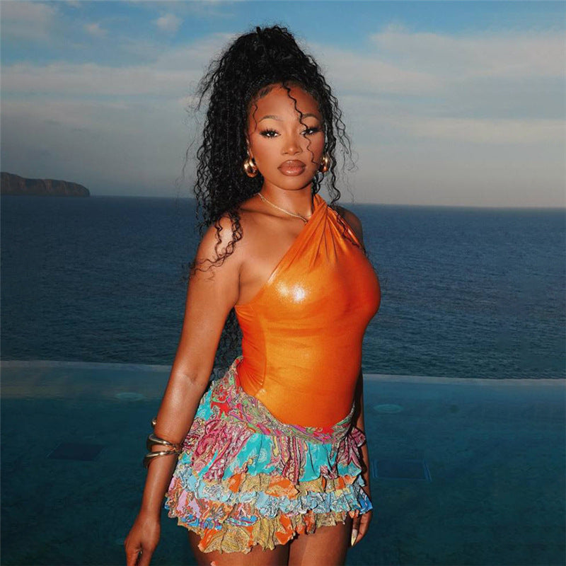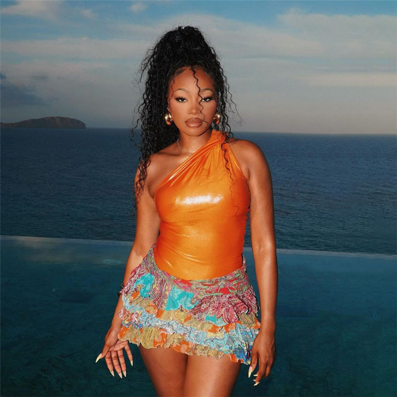 This playful mini skirt features a vibrant paisley print over a comfortable fabric. The skirt is constructed with tiered ruffles, which add volume, movement, and a feminine aesthetic. The short length makes this a fun and breezy piece, perfect for daytime outings or adding a stylish flair to a casual outfit.